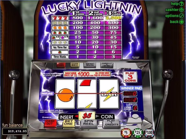 Lucky Lightning is what is considered a simple slots game, one that used to be called a one armed bandit. This game has three reels and one payline. Everything about the game can be seen in the screen of the game including all of the symbols. There are bars, cherries, oranges, plums red sevens and blanks. Players may try out the game for fun before placing real money bets if they feel the need to. The player can place up to three coins per bet with an option of different coin sizes that range from $0.05 up to $5 giving a maximum bet of $15 per spin.